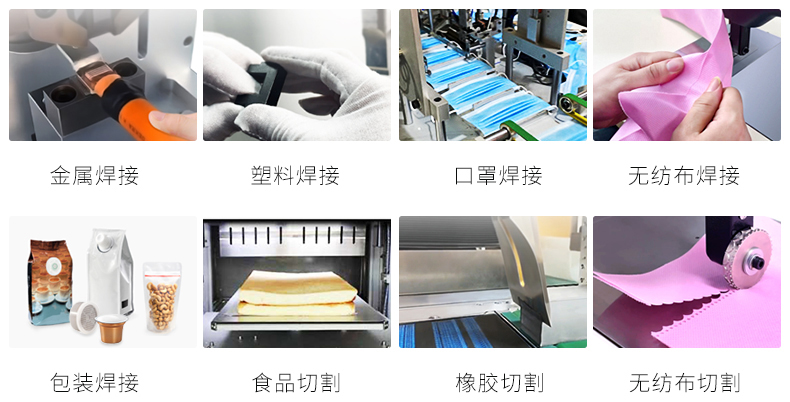 適用于各類超聲波焊接應(yīng)用。例如金屬焊接,塑料焊接,口罩焊接,無紡布焊接,無紡布切割,包裝焊接,食品切割,橡膠切割,超聲波萃取等。