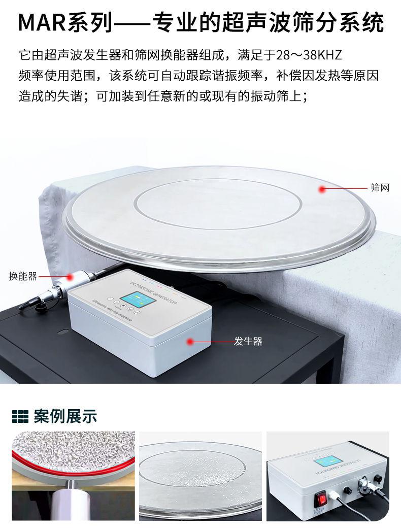 答:超聲波振動(dòng)篩是在原有的旋振篩上加裝一個(gè)低振幅、高頻率的超聲波振動(dòng)波儀(機(jī)械波),超微細(xì)粉體接受巨大的超聲加速度,使篩面上的物料始終保持懸浮狀態(tài),從而抑制粘附、摩擦、平降、等堵網(wǎng)因素。解決了強(qiáng)吸附性、易團(tuán)聚、高靜電、高精細(xì)、高密度、輕比重等篩分難題,使超細(xì)微粉篩分不再難事,有別于傳統(tǒng)發(fā)生器低振幅難以工作的缺點(diǎn),能將易結(jié)團(tuán)、粘性粉末從篩網(wǎng)表面移除,增加篩分產(chǎn)能,提升粉末篩分效率,將篩分目數(shù)降低至20微米(635目)。