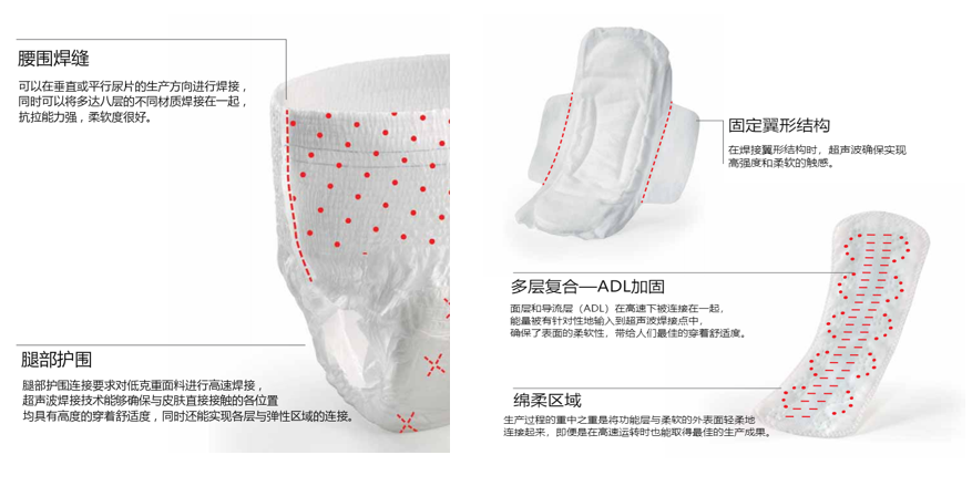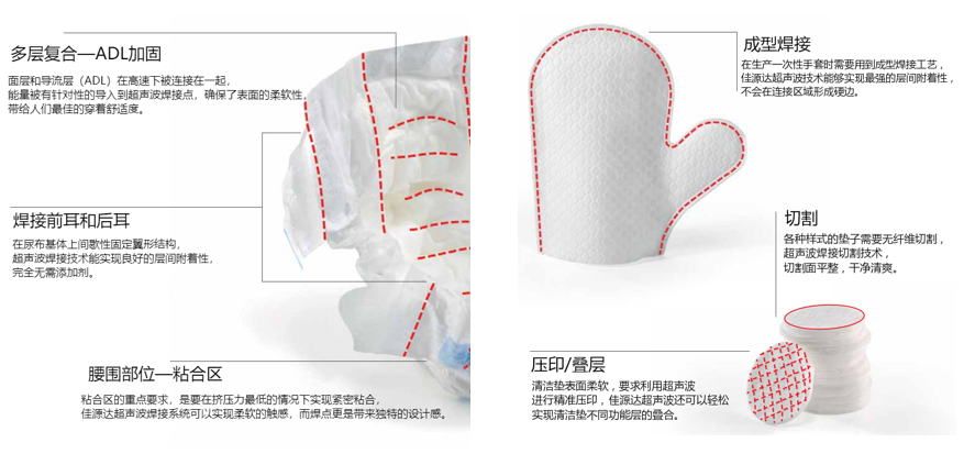 佳源達(dá)焊接系統(tǒng)在成人衛(wèi)生用品,女士衛(wèi)生用品,嬰兒衛(wèi)生用品,化妝和皮膚護(hù)理用品等衛(wèi)生用品的應(yīng)用上,能保證產(chǎn)品有很強(qiáng)的抗拉能力,體驗(yàn)感觸感超好的舒適度。