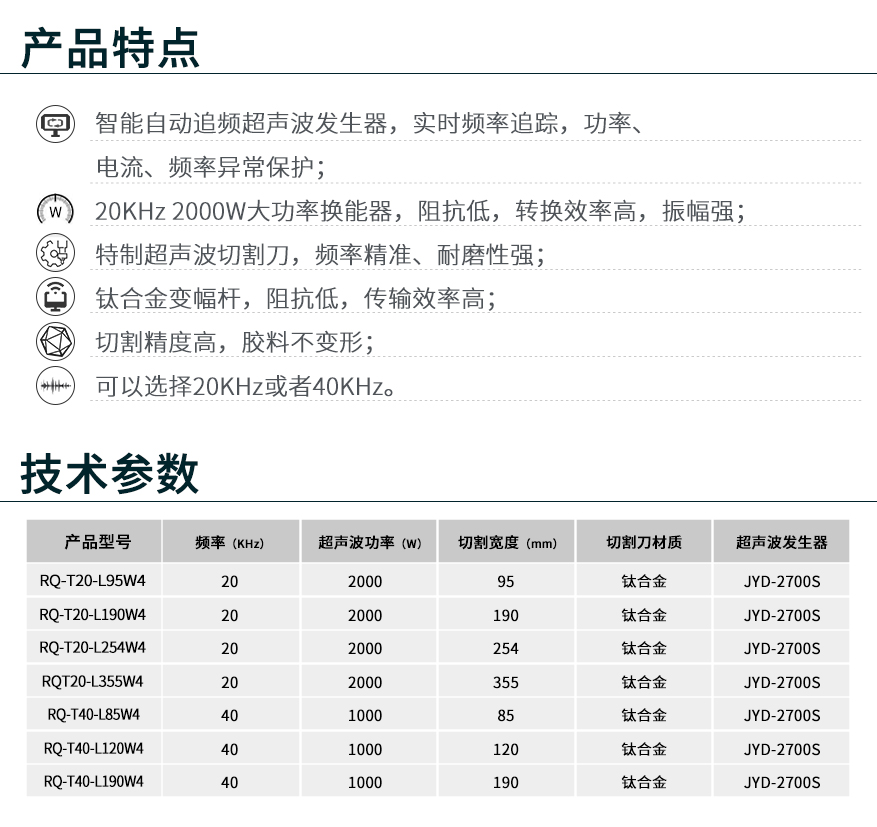 超聲波橡膠切割系統(tǒng)由自動追頻發(fā)生器、高Q值超聲波換能器、鈦合金切割刀組成,在橡膠切割方面有良好的表現(xiàn)。整機(jī)安裝簡單方便,頻率實(shí)時(shí)跟蹤,振幅可調(diào),異常保護(hù)等;可通過PLC或RS485通訊控制。