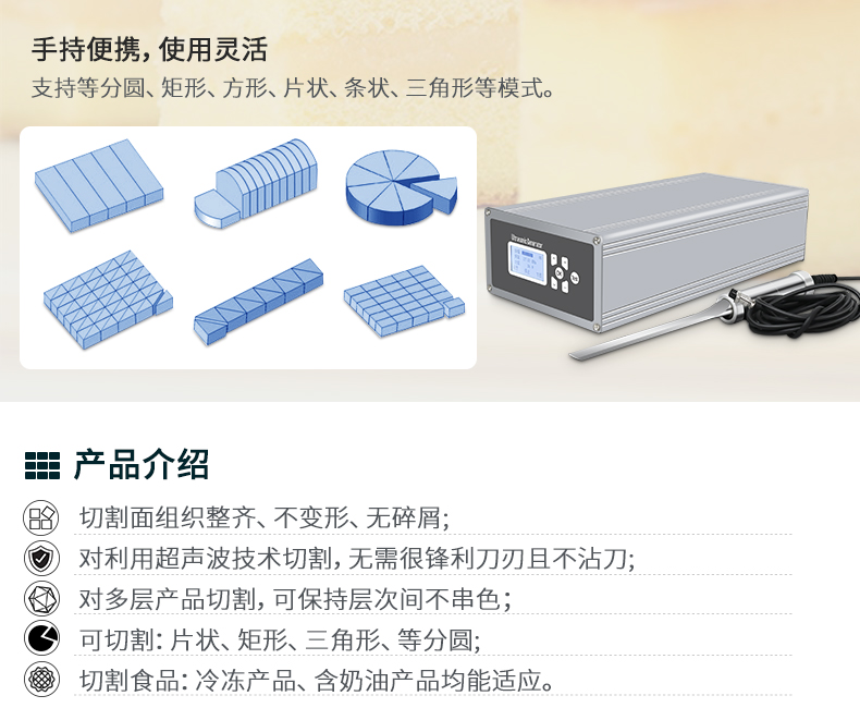 佳源達手持式超聲波切割刀2801Q,切割出來的食品,表面整齊,無碎屑,美觀;適用于不同厚度及硬度的糕點食品,如奶酪、蛋糕、面包、披薩、軟糖等食品。