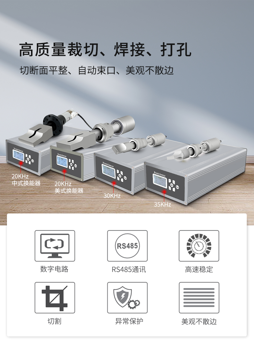 佳源達(dá)超聲波焊接發(fā)生器 JYD-2800S系列超聲波裁斷系統(tǒng)有多種尺寸可供選擇,能適用于不同的結(jié)構(gòu)安裝,具備裁切、焊接、打孔等功能,可連續(xù)24小時工作,性能穩(wěn)定,速度高達(dá)80~200次/min;切斷面平整、自動束口、美觀不散邊,廣受客戶的青睞。
