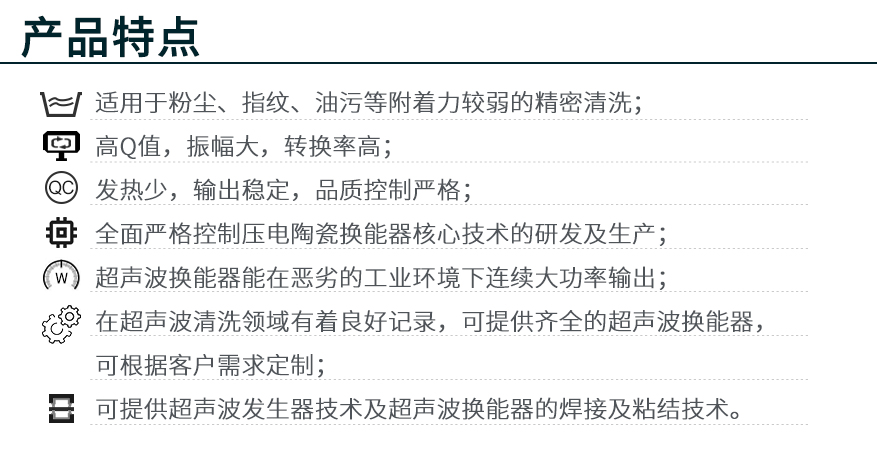 高頻超聲波換能器,適應指紋、粉塵油污等附著力較弱的精密清洗。高Q值、振幅大、轉換率高、發(fā)熱少、輸出穩(wěn)定,嚴格的質量監(jiān)控??筛鶕?jù)客戶不同需求提供定制服務。
