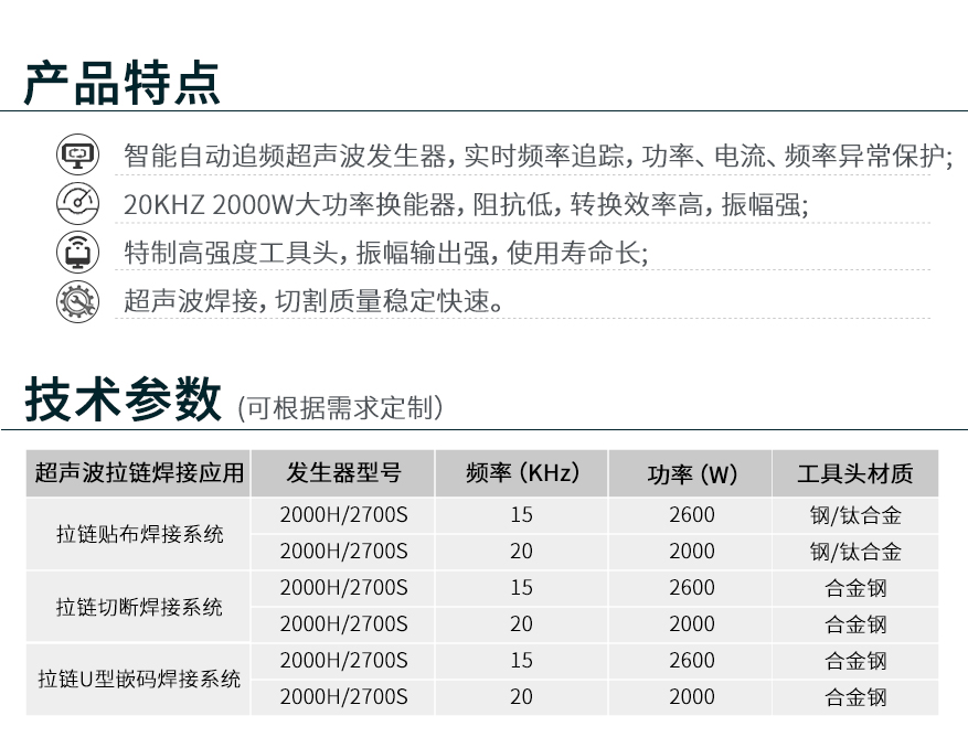 超聲波拉鏈焊接系統(tǒng)由智能追頻超聲波發(fā)生器、大功率超聲波換能器、高強(qiáng)度工具頭三大核心部件組成。在拉鏈貼布、切斷、U型嵌碼方面有良好的表現(xiàn)。整機(jī)安裝簡(jiǎn)單方便,頻率實(shí)時(shí)跟蹤,振幅可調(diào),異常保護(hù)等;可通過(guò)PLC或RS485通訊控制。