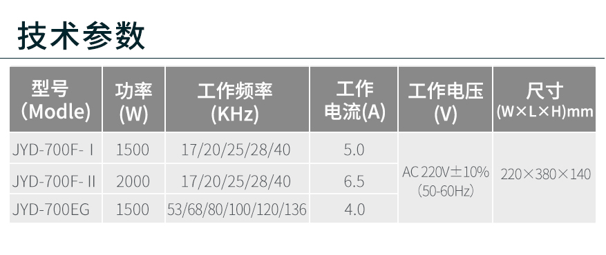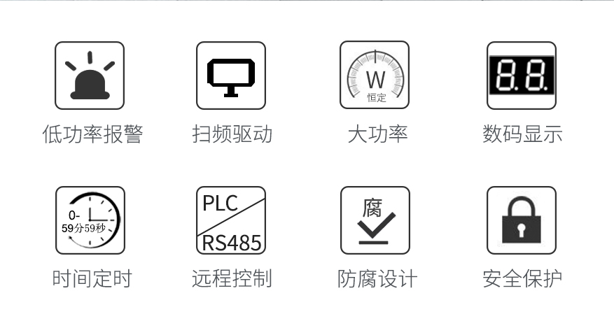 佳源達(dá)超聲波發(fā)生器 JYD-700F恒功率輸出,防腐蝕設(shè)計(jì),領(lǐng)先的MCU-SWEEP掃頻技術(shù),保證換能器一直在最佳的工作狀態(tài)。LED顯示電流,頻率,定時(shí),增加RS485和PLC通訊接口。