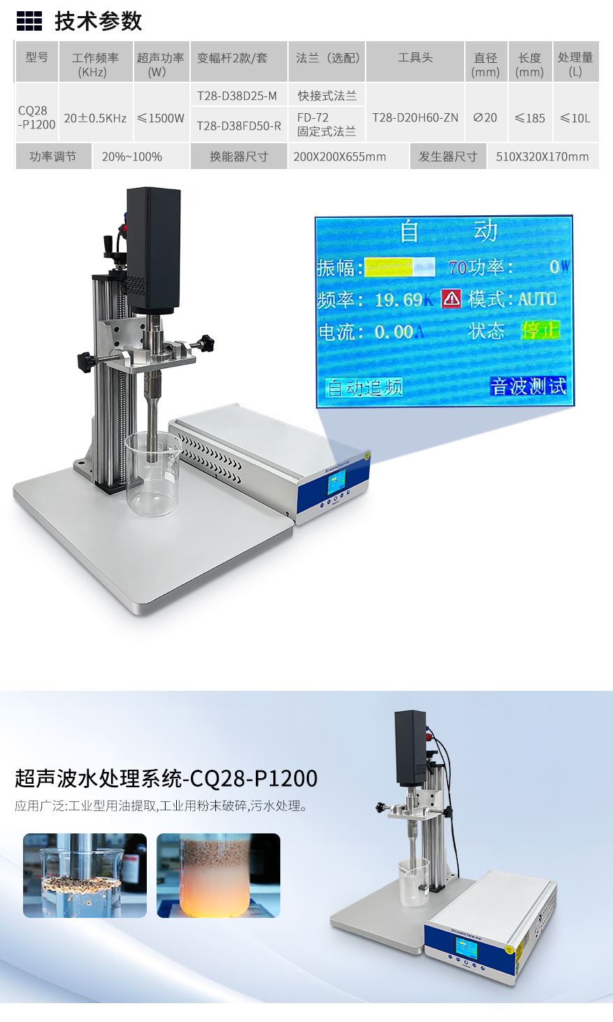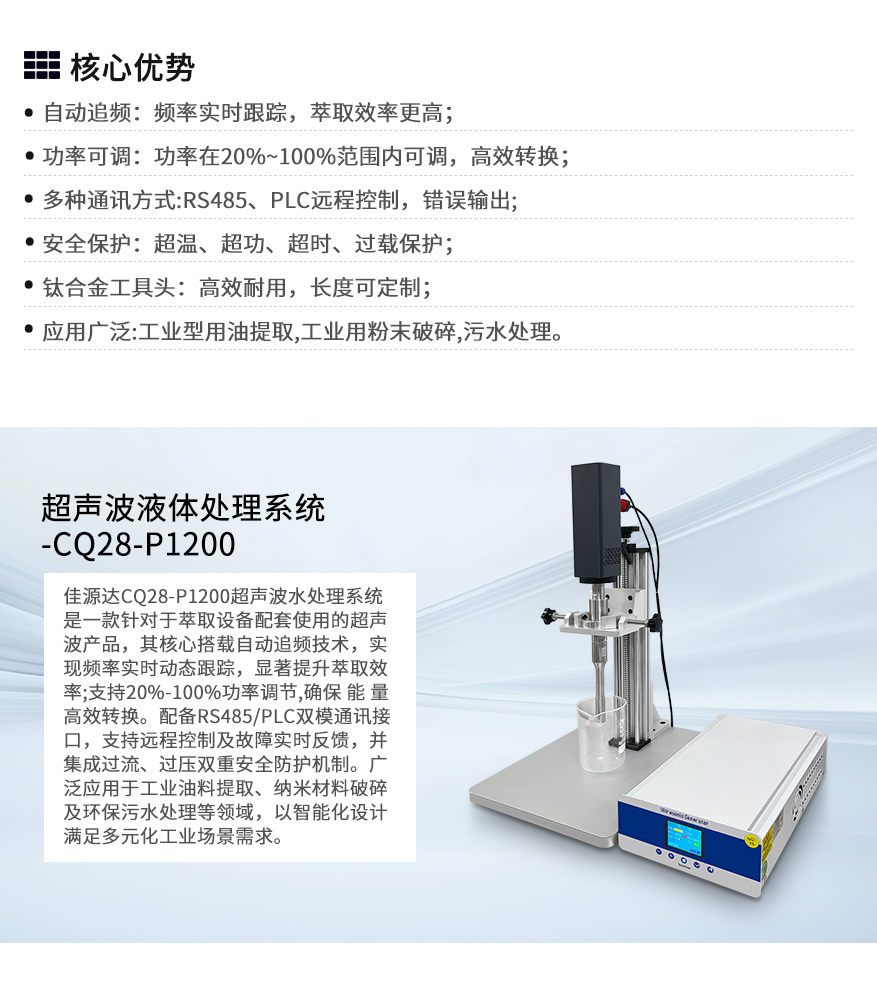 CQ28超聲波萃取系統(tǒng)是一款針對于萃取設備配套的超聲波產品。智能自動追頻超聲波發(fā)生器、高Q值大功率換能器、鈦合金萃取工具頭組成的超聲波核心配件應用于萃取、勻化、攪拌、乳化等方面都有良好的表現(xiàn)。系統(tǒng)自動追頻、功率可調、振幅可調、異常報警等功能。配備RS485通訊可以通過HMI更改和觀察各項參數(shù)。